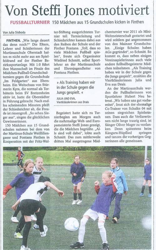 Am 3.7.2013 organisierte die Martinusschule Mainz in Kooperation mit dem VfL Fontana Finthen zum dritten Mal dieses Turnier. Zum ersten Mal allerdings im Auftrag und in Kooperation der Fritz-Walter-Stiftung, was sich als Riesengewinn herausstellte.