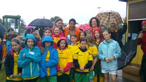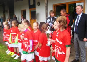 Die Nationalhymne wurde gespielt, als unser Ehrengast eintraf. Es war niemand anders als die Direktorin für Mädchen und Schulfußball beim DFB, Steffie Jones. Die Welt- und dreimalige Europameisterin war auf Initiative von Anne Fröder, Mädchenwartin im Kreisjugendausschuss, gekommen. Sie zeigte sich von einer sehr sympathischen Seite. Bereitwillig ließ sie sich mit den Mannschaften und einzelnen Kindern fotografieren und schrieb Autogramme.